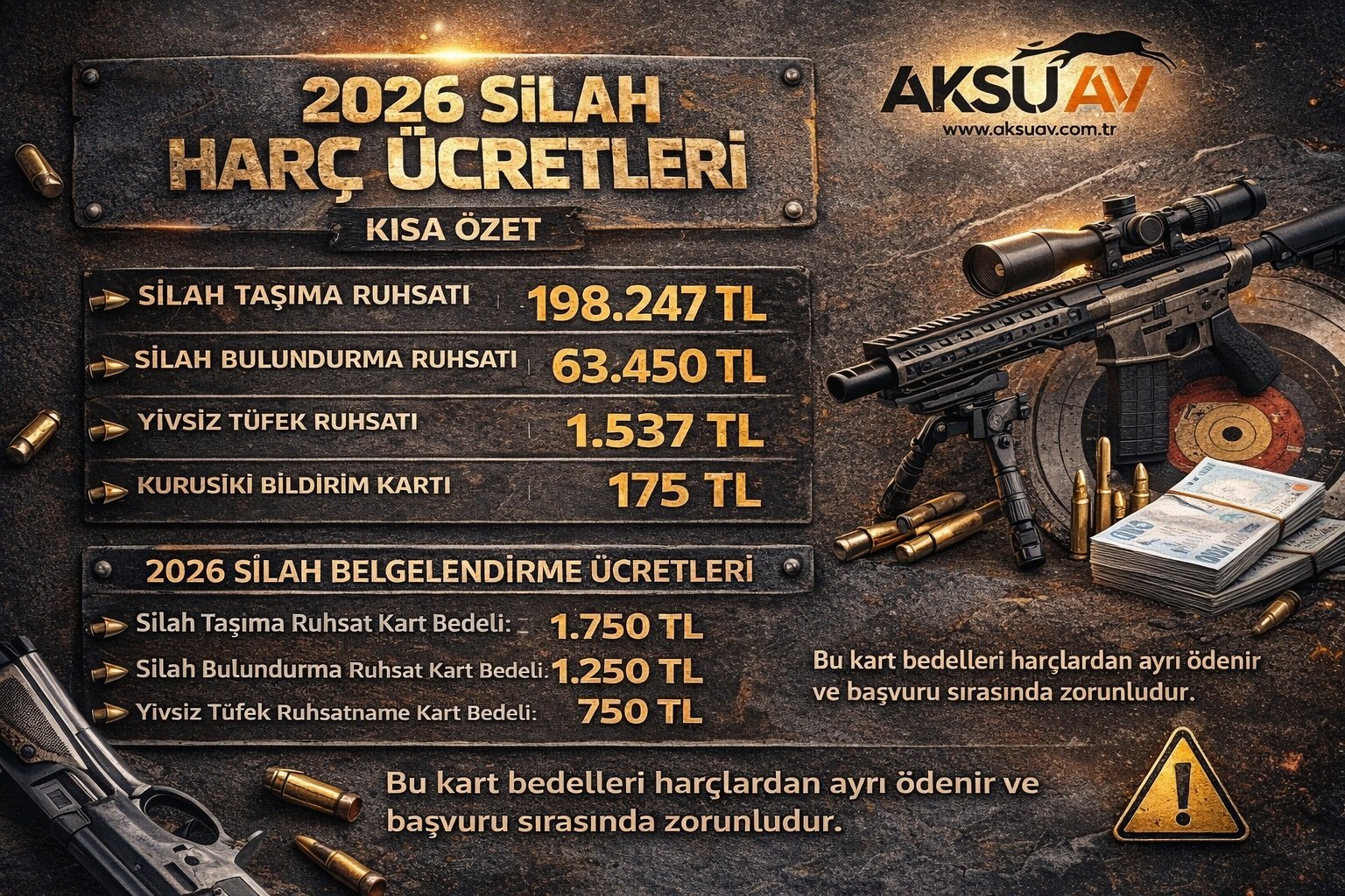 2026 yılında silah taşıma ruhsatı harcı 198.247 TL, silah bulundurma ruhsatı harcı 63.450 TL, yivsiz tüfek ruhsatname bedeli 1.537 TL, kurusıkı bildirim kart bedeli ise 175 TL olarak uygulanmaktadır.